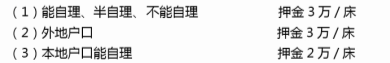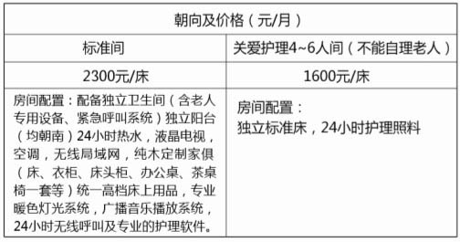 一、收费标准 1.床位费 2.押金 3.餐费 (1)标准营养套餐:750元/月 (2)特殊饮食,零点用餐,按实际价格收费 4.一次性安置费(含被褥,生活用品等) (1)800元/人(关爱护理4-6人间) (2)1000元/人(标准间) (3)1500元/间(包房) 5.冬季取暖费为每月按北京市取暖收费标准实际收取900元(4个月)。 6. 护理费 (1)能自理老人(三级)护理服务费500元/月 (2)半自理老人(二级B、二级A)护理服务费1400-1800元/月 (3)不能自理老人(一级B、一级A)护理服务费2800-3800元/月 (4)特护(一对一专护)护理服务费另行协商 另外:包间的老人,两张床费相加再减400元(2500元+2500元)-400元=4600元 (2300+2300)-600元=4600元 二、护理服务 1.自理老人生活护理 (1)每天清洁房间卫生,一周清洗一次床单、半个月一次晾晒被褥。 (2)每天护士定时巡视查房、测量血压2次,每周测体重计生命体征一次。 2.半自理老人生活护理 (1)包括上述内容; (2)提供推轮椅、就餐、户外活动、洗头、洗澡、修剪手脚指甲、 送餐到房间、清洗餐具、水杯、洗衣服、送开水; (3)每天护士进行生命体征检测一次,随时提供医陪服务,护士发药、并监督服用药品,记录大小便情况。 3.不能自理老人生活护理 (1)包括上述内容; (2)不能自理一级B:处理大小便,清洗会阴部,做晨晚间的护理工作,喂饭、喂药、清洁消毒便盆。护理人员定时巡视房间,及时完成各种护理工作,做好安全防范工作,并记录。 (3)不能自理的一级A:包括上述内容。每2小时翻身、扣背一次,及时更换尿垫、尿裤或尿袋、足浴。鼻饲饮食饮水,由护士完成常规护理与技术操作。 三、基本服务内容 1.入住房间 (1)入住期限的使用权,含水、电、网、有线电视,物业等费用。 (2)每月送每位老人20度电,超出部分自付,水费全免。 2.健康管理服务 身体健康状况初步评估入住前到定点医院(常营医院)体检,每月一次身体健康状况详细评估,每年一次健康体检,建立个人健康档案,精神关怀,心理督导服务,日常量血压,买药就诊提醒。 3.基础生活护理服务 每日一次房间清洁,每周一次房间消毒,按需求代订书报,半月一次换洗床上用品,按需送开水,送加餐,半年一次换洗窗帘,一月一次免费理发。 4.值班服务 护理人员、保安、楼层护工,24小时值班 5.物业服务 保证房间和场所内的所有设施的安检和维护